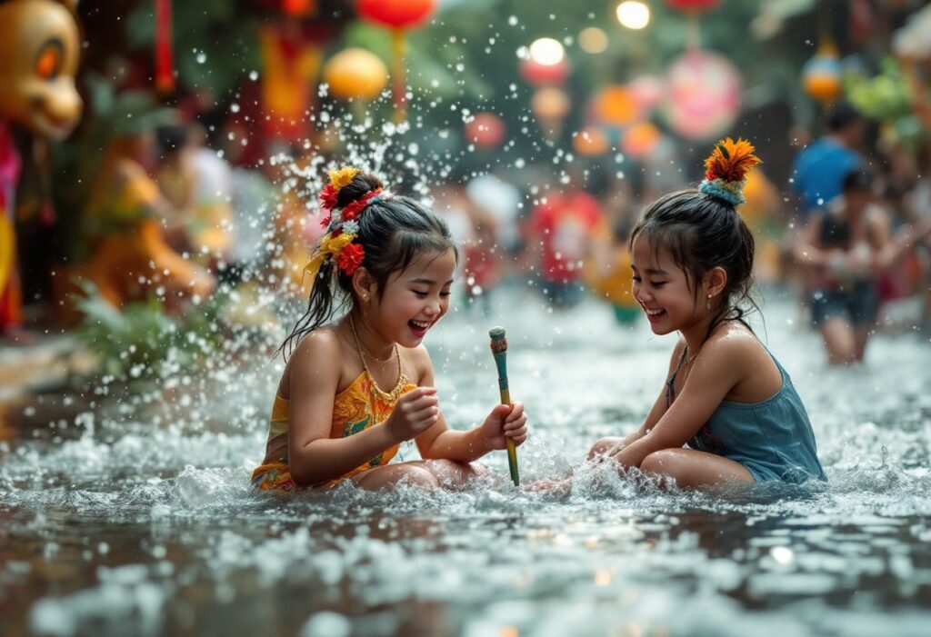 Songkran marque le Nouvel An thaïlandais avec de vastes célébrations incluant des batailles d’eau. Ces jeux festifs transforment toutes les rues en arènes de bonheur liquide. À Bangkok, rendez-vous sur Khao San Road pour faire partie d’une immense foule prête à se mouiller, tandis que Chiang Mai propose une expérience inoubliable grâce à ses douves mémorables facilitant une gigantesque bataille d’eau.